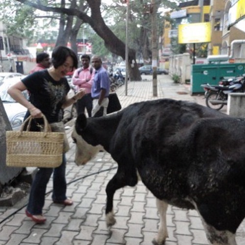 野良牛に攻撃されて、買い物カゴを奪われそうになった。ムスリムが暮らすエリアの野良牛は、比較的、目つきが悪く、攻撃的なタイプが多いように見受けられる。諸々、待遇の違いがあるのだろう。
