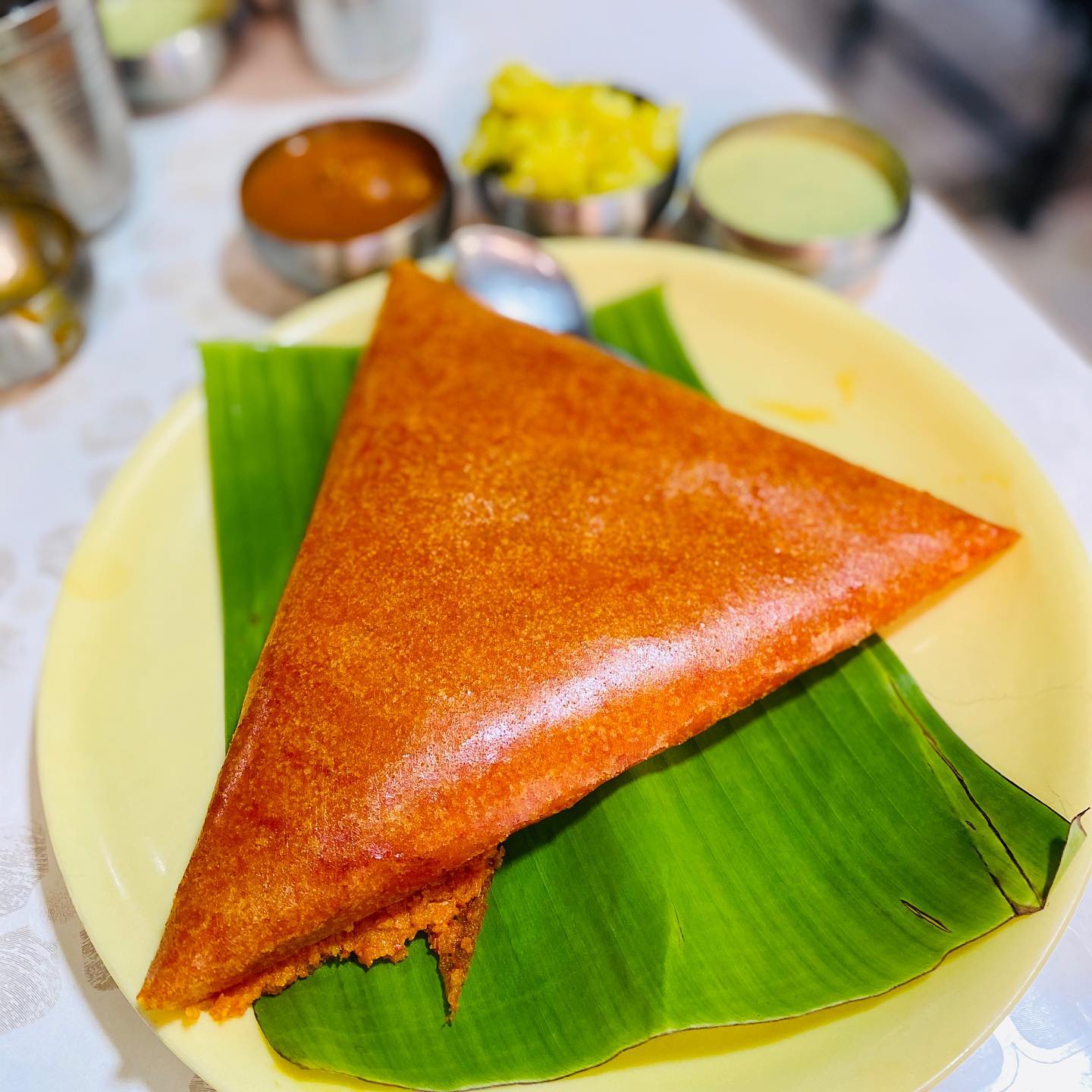 黄金色に輝くドーサ。筒状に巻かれるものあり。クリスマスの三角帽子のように立体的なものあり。しかしこの店のそれは、無造作な折り曲げ三角。その姿は「どっしりとした食べ応え」を物語る。