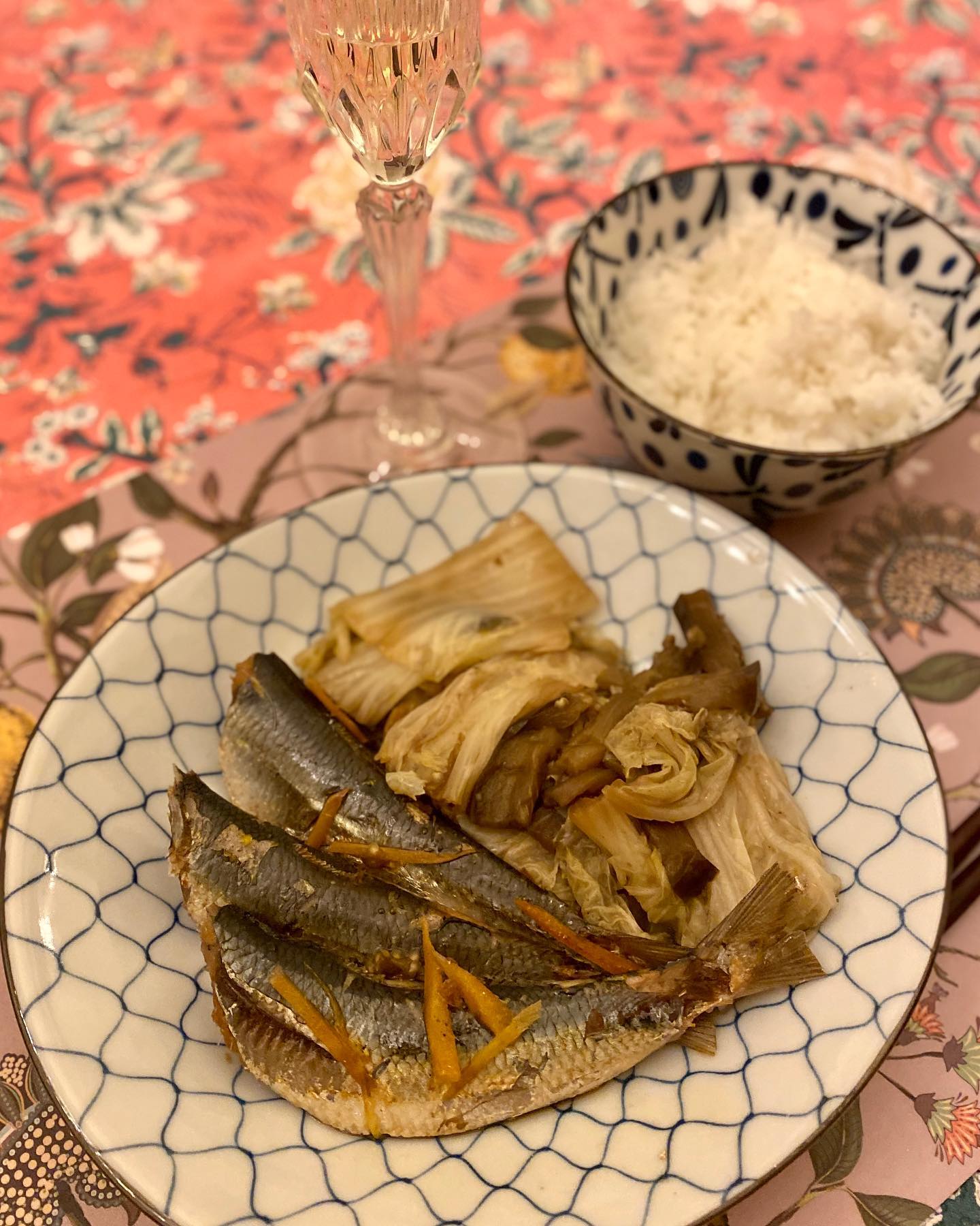 他にたいしたおかずも用意せず、白菜と茄子の煮物のようなものを添え、日本米を炊いただけの地味食。地味ながらも、おいしい。