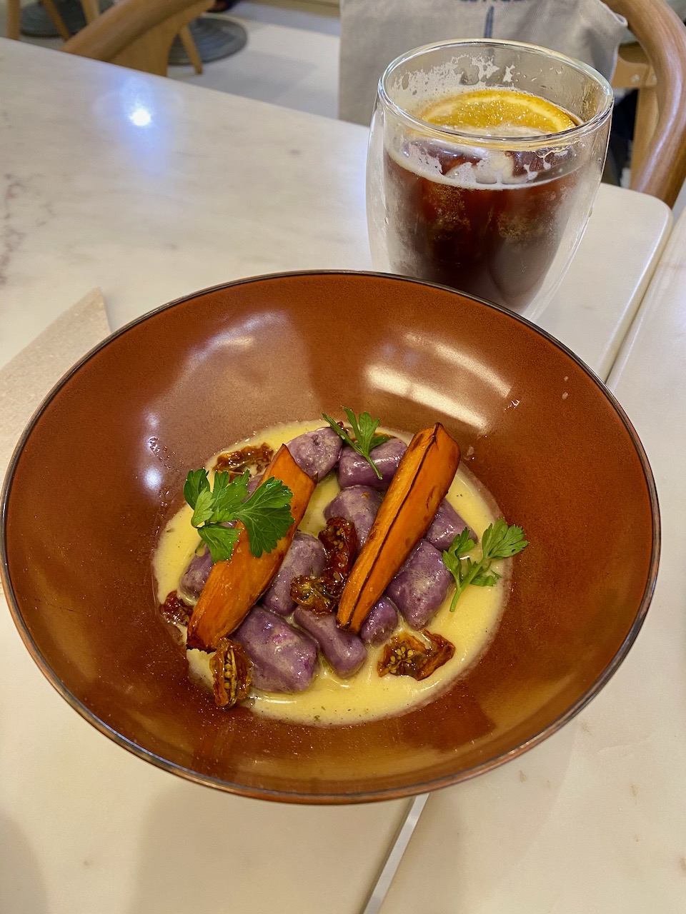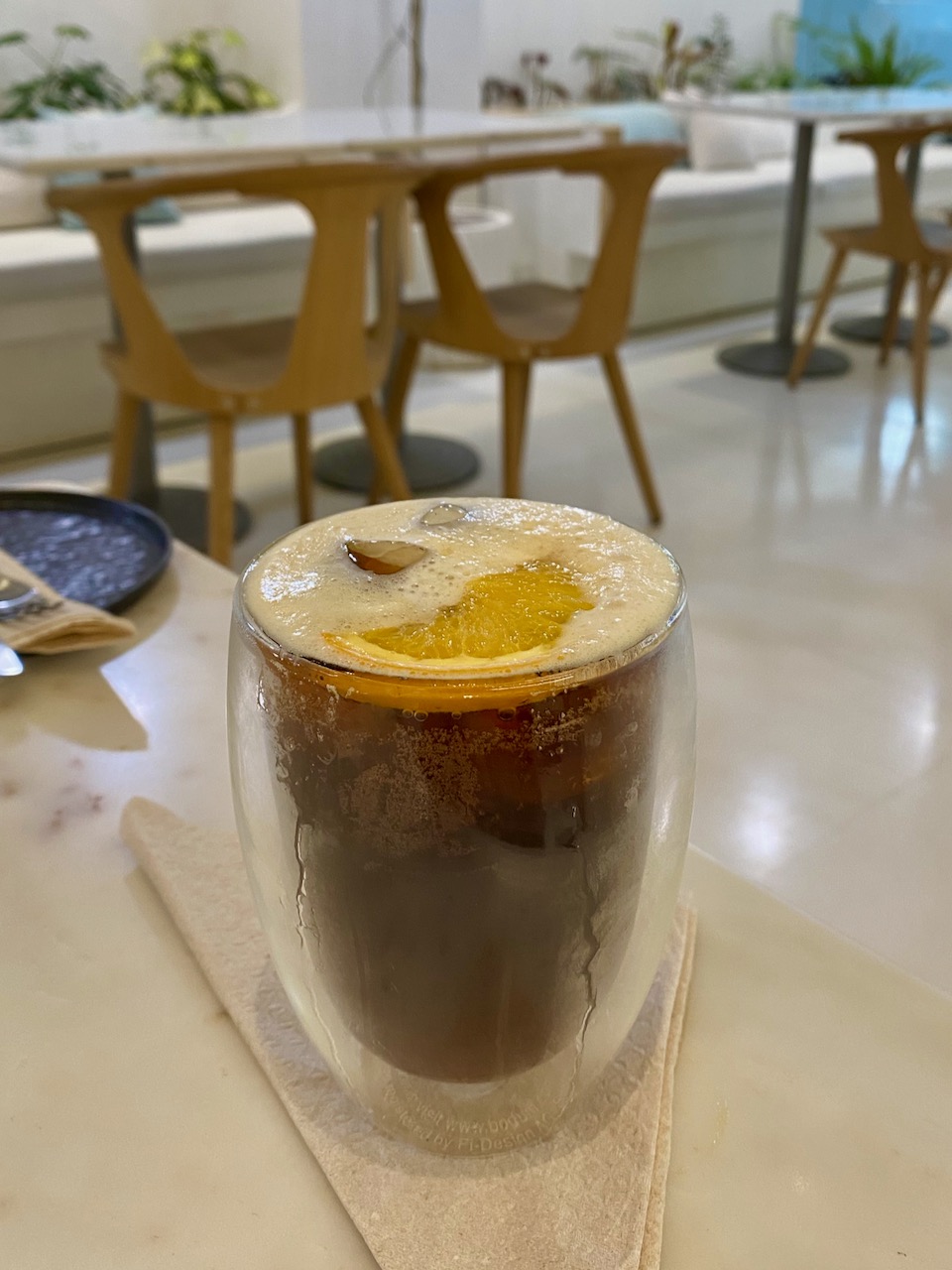 まずはお気に入りのコールドコーヒー(オレンジやジンジャーなど、ほどよい味付けが効いたものが数種類あり)で乾杯。