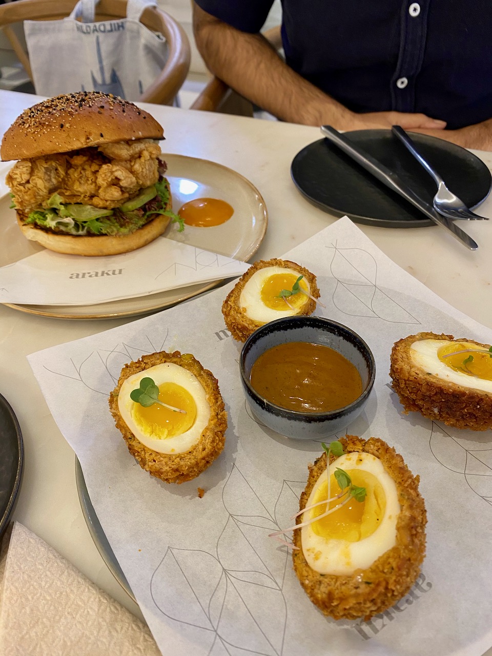 フライドチキンバーガー(メニュー上はサンドイッチとされている)は、「KFCのジンガーバーガーを高級かつヘルシーにした感じ」の味わい。ジャンクフード的な料理を健康的に味わえるところが魅力だ。スコッチエッグもまた、程よい旨味と卵のおいしさ。