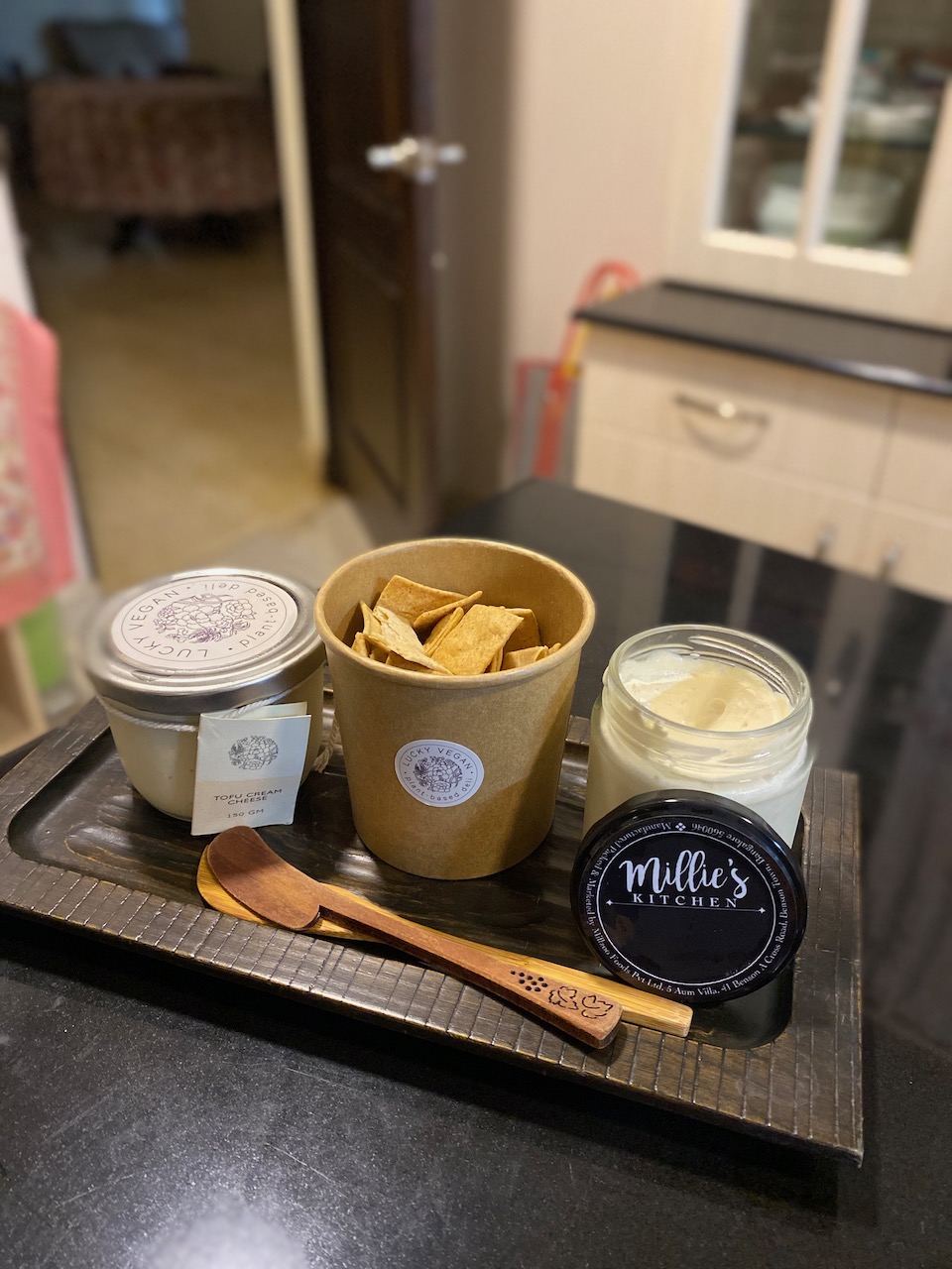 案内してくれたナム曰く、彼女は、インドにおけるヴィーガン・チーズのパイオニアだとのこと。ラベルがまだ間に合っていない新製品の「トリュフ・クリームチーズ」が、非常〜においしい! バンガロール&ムンバイで入手できるようだが、オンラインサイトが整っていないので、インスタグラムからDMを送り、DUNZOなどで配達してもらう。ハード系のチーズは、わたしはやはり「乳製品」が好きなので、敢えてヴィーガンを買うことはないと思うが、ディップ系はどれも美味。