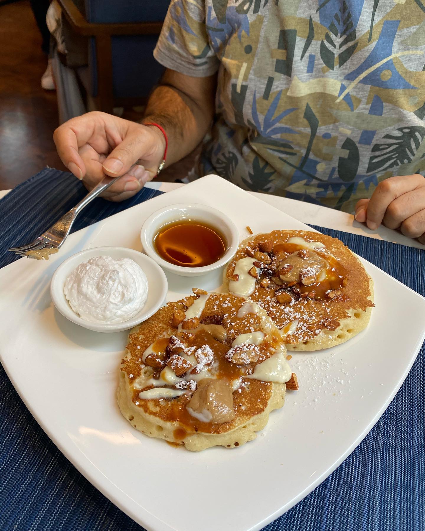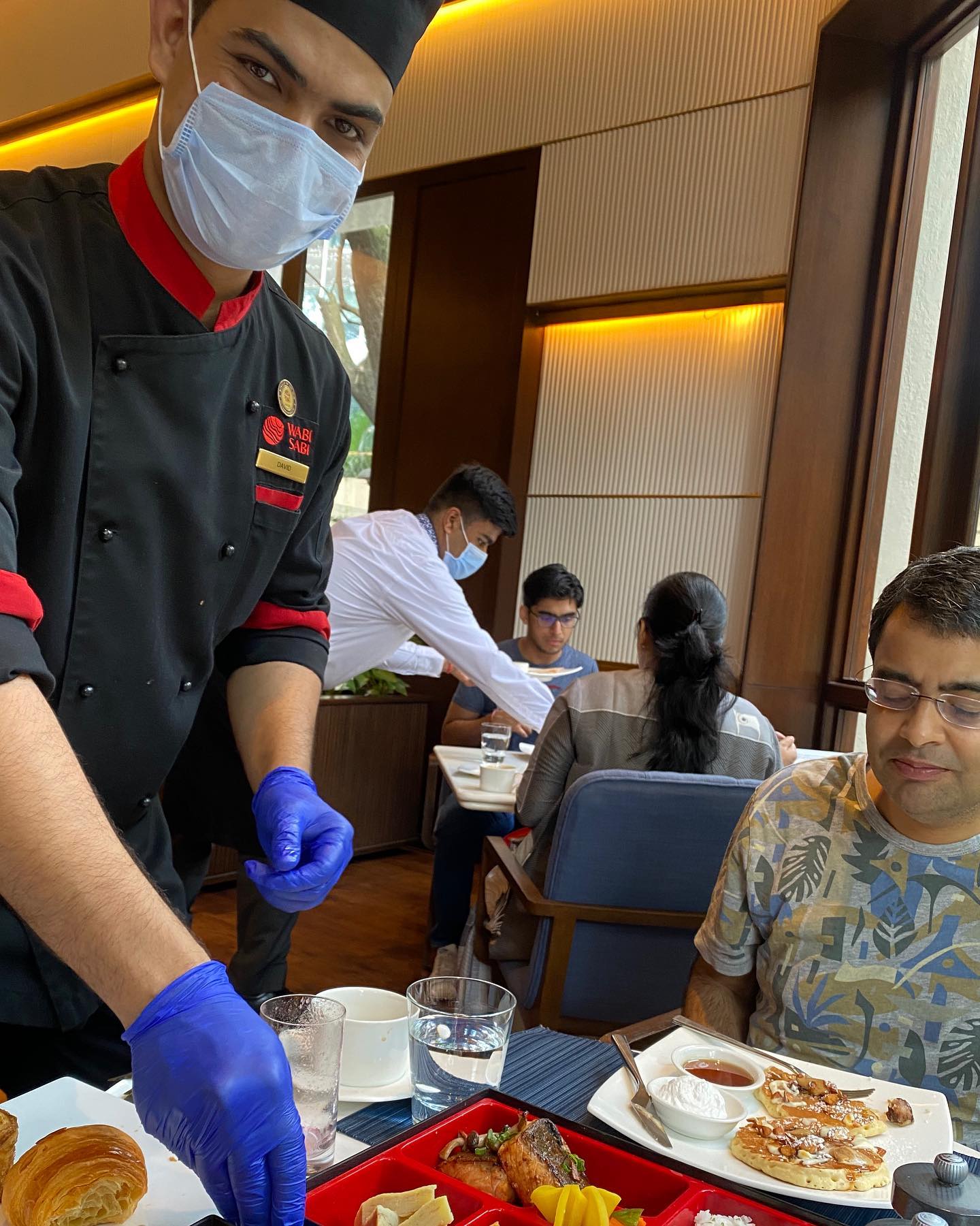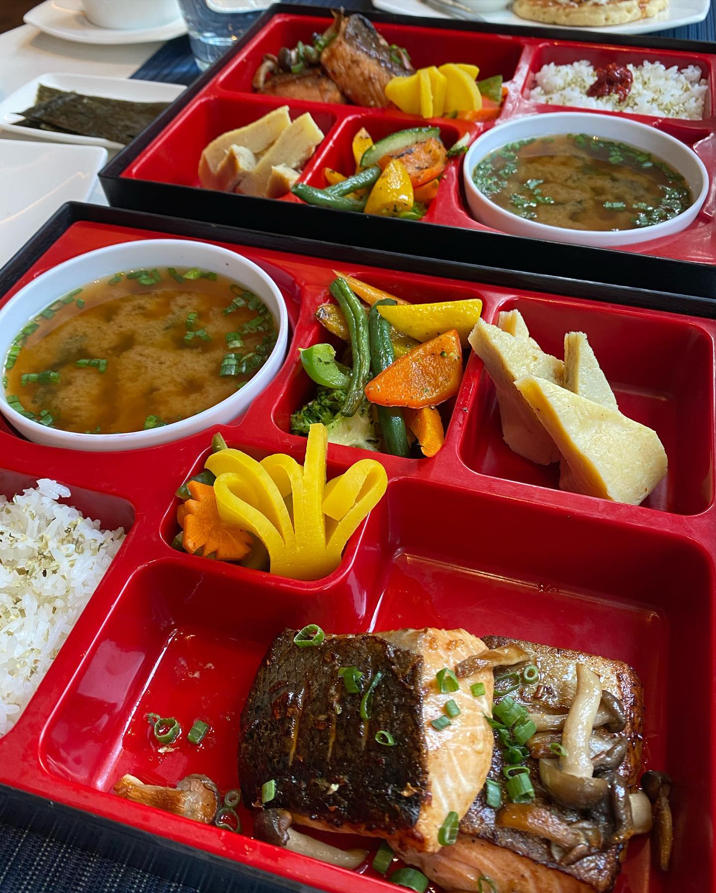 朝食を食べ始めていたら、昨夜の「WABISABI」のハンサムなシェフが席に来てくれて、特別に日本料理を提供してくれるという。パンケーキなどを頼んだにもかかわらず、お願いしたところ、なんとも立派な弁当ボックスが!