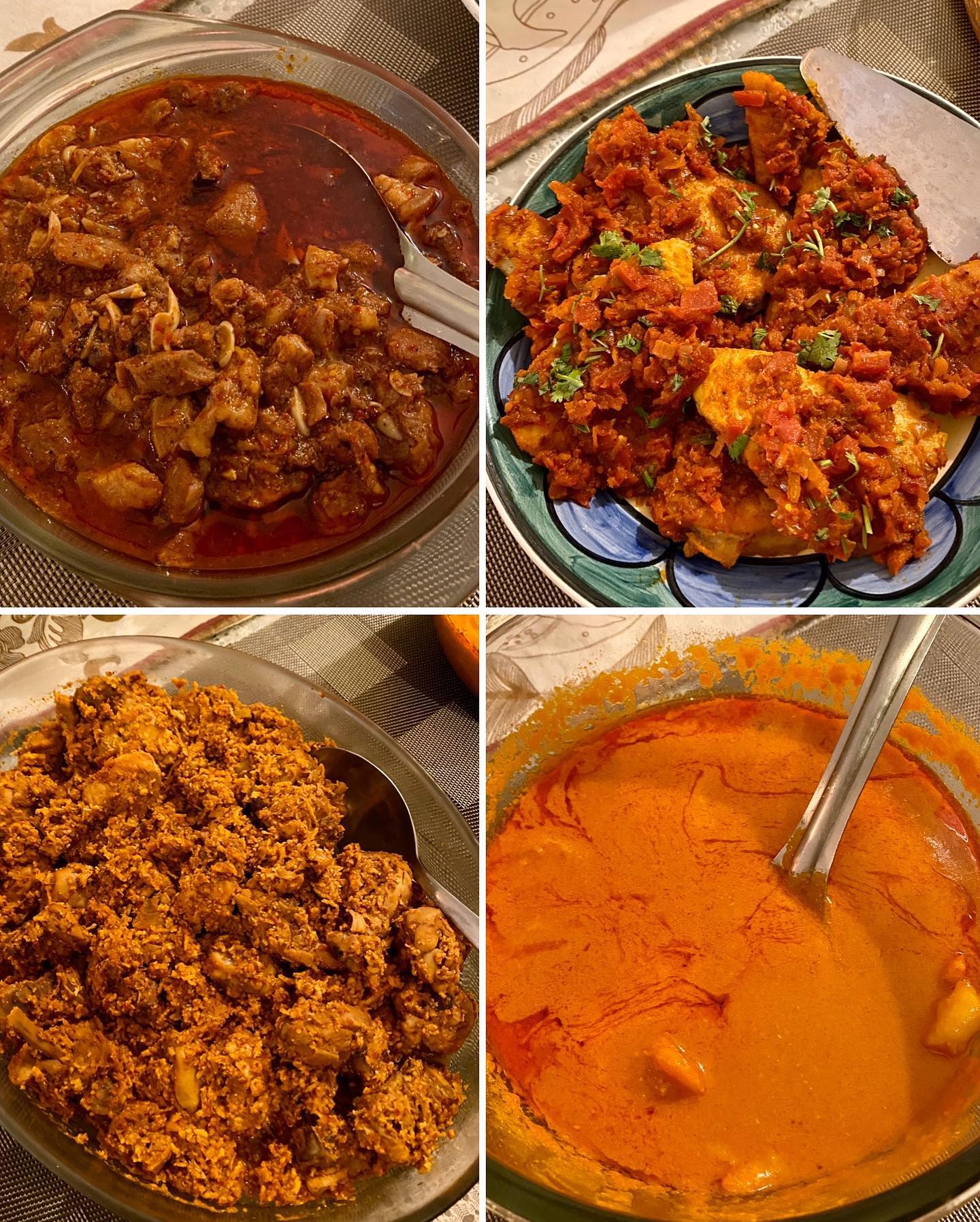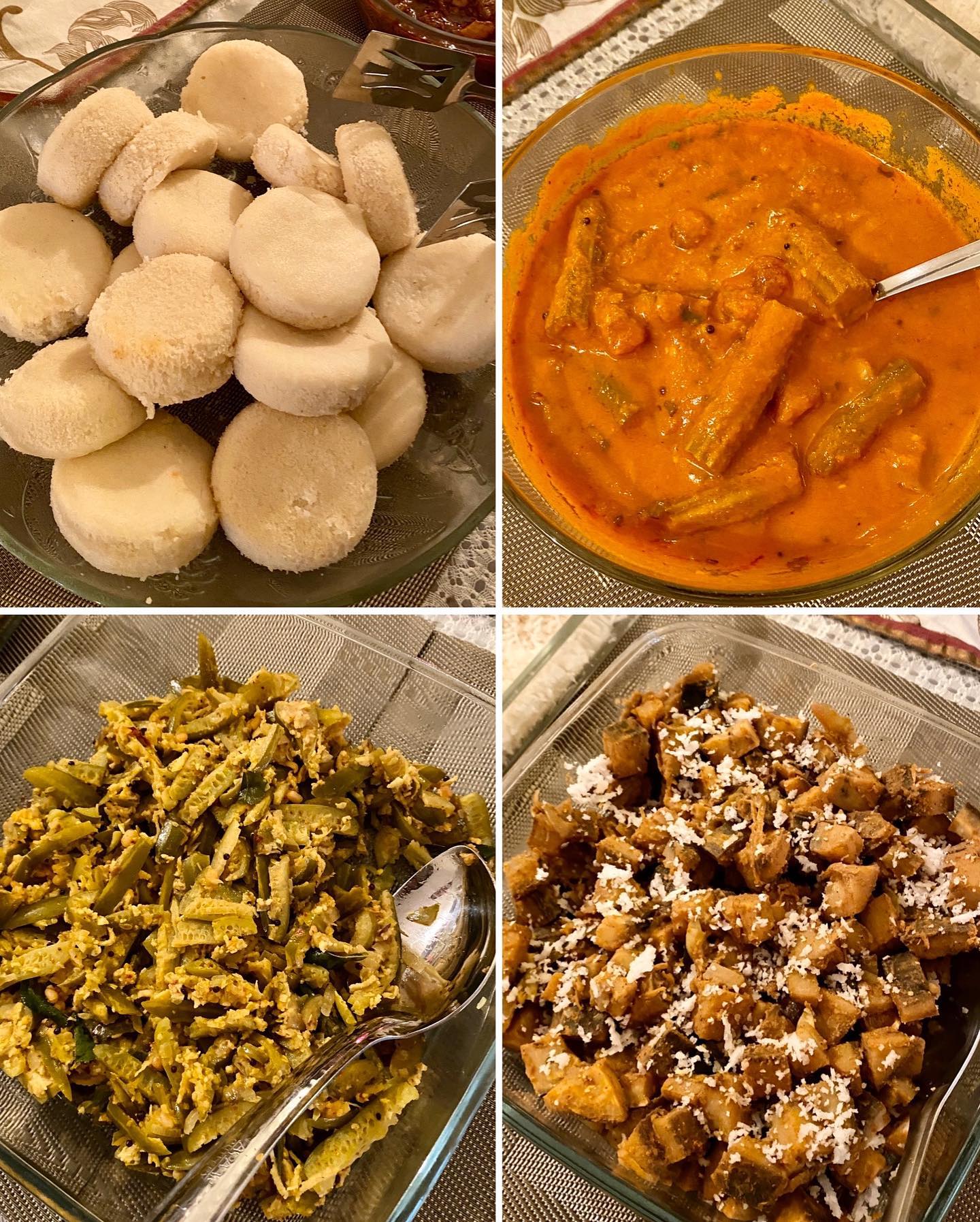 友人夫妻は子供のころからバンガロールに暮らしているが、出自はマンガロールのクリスチャン。食卓には、マンガロールのクリスチャンコミュニティで食されるという、イディリに似たサナ(Sanna)という米粉を発酵させて作った蒸しパンをはじめ、豚肉、鶏肉、魚、エビなどのノン・ヴェジタリアン料理、そしてバナナやドラムスティックのカレー、ナスのマリネ、きゅうりのライタなどのヴェジタリアン料理が並ぶ。
