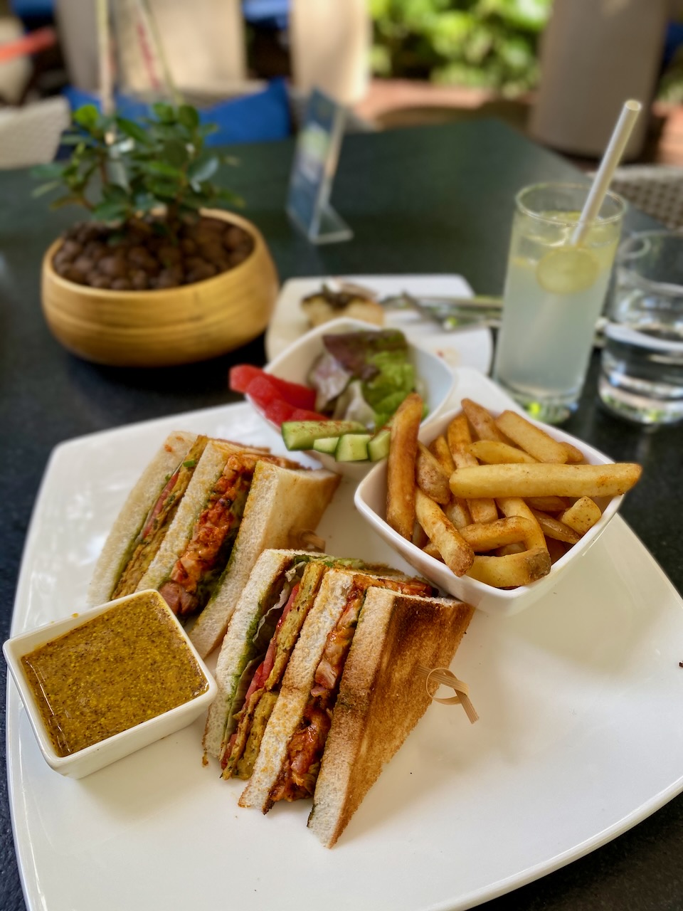 🥪追記/かつて、インドのカフェレストランといえば、「クラブハウス・サンドイッチ」が定番だった。インドの人は「温かい料理」を好むので、サンドイッチもホットなクラブハウスが人気なのだ。久しぶりに注文したところ、ヴォリュームたっぷり、具がたっぷりの豪華な一皿が供された。おいしい。