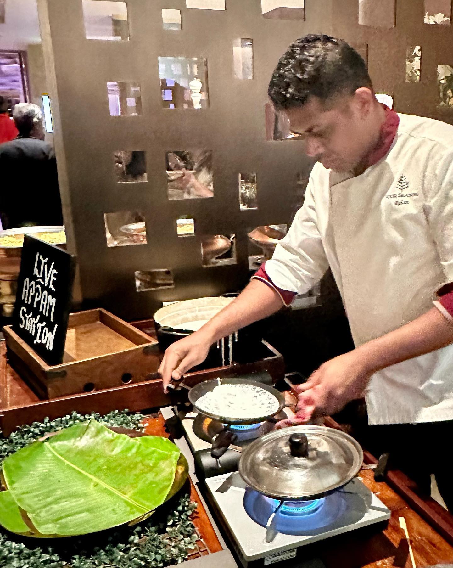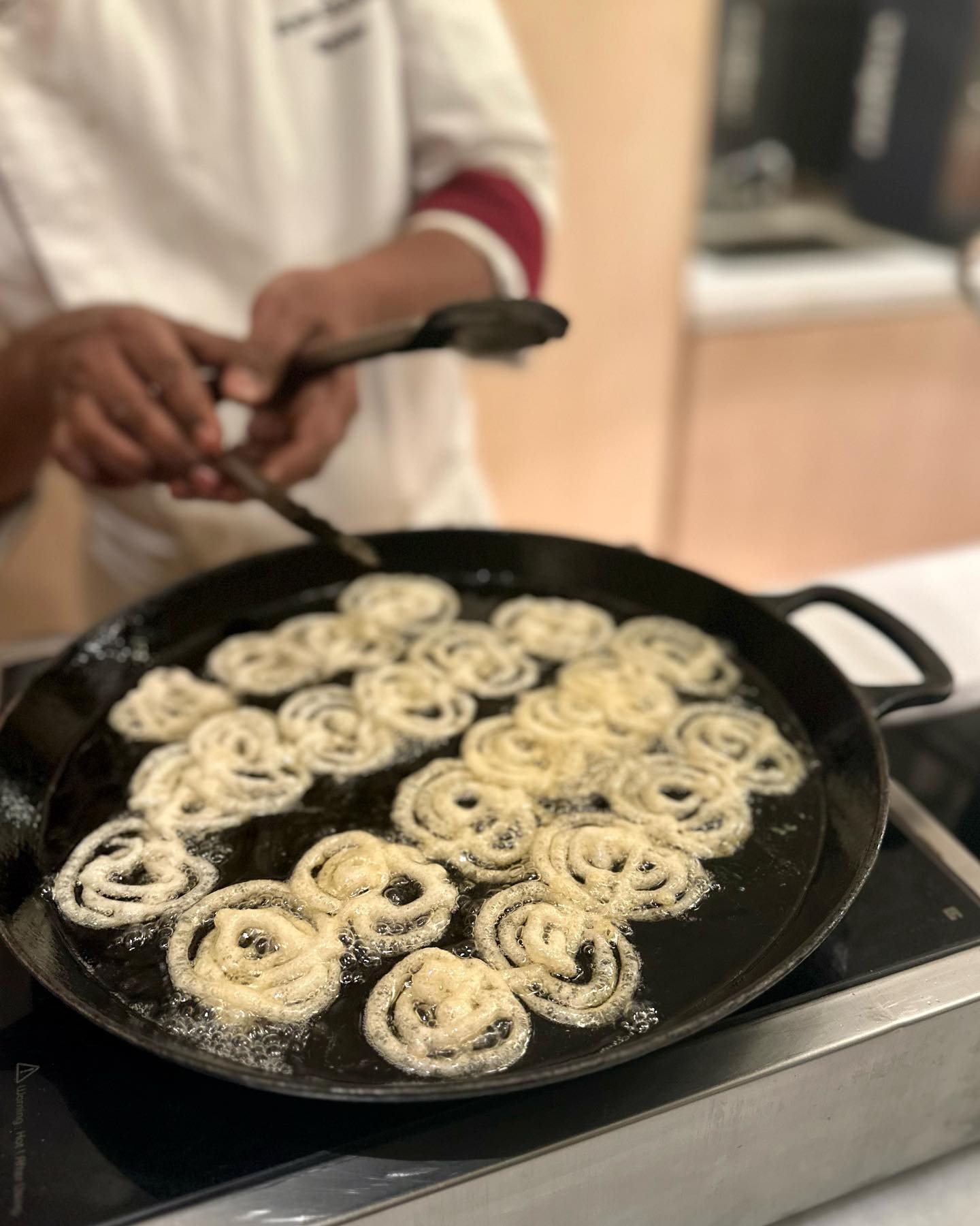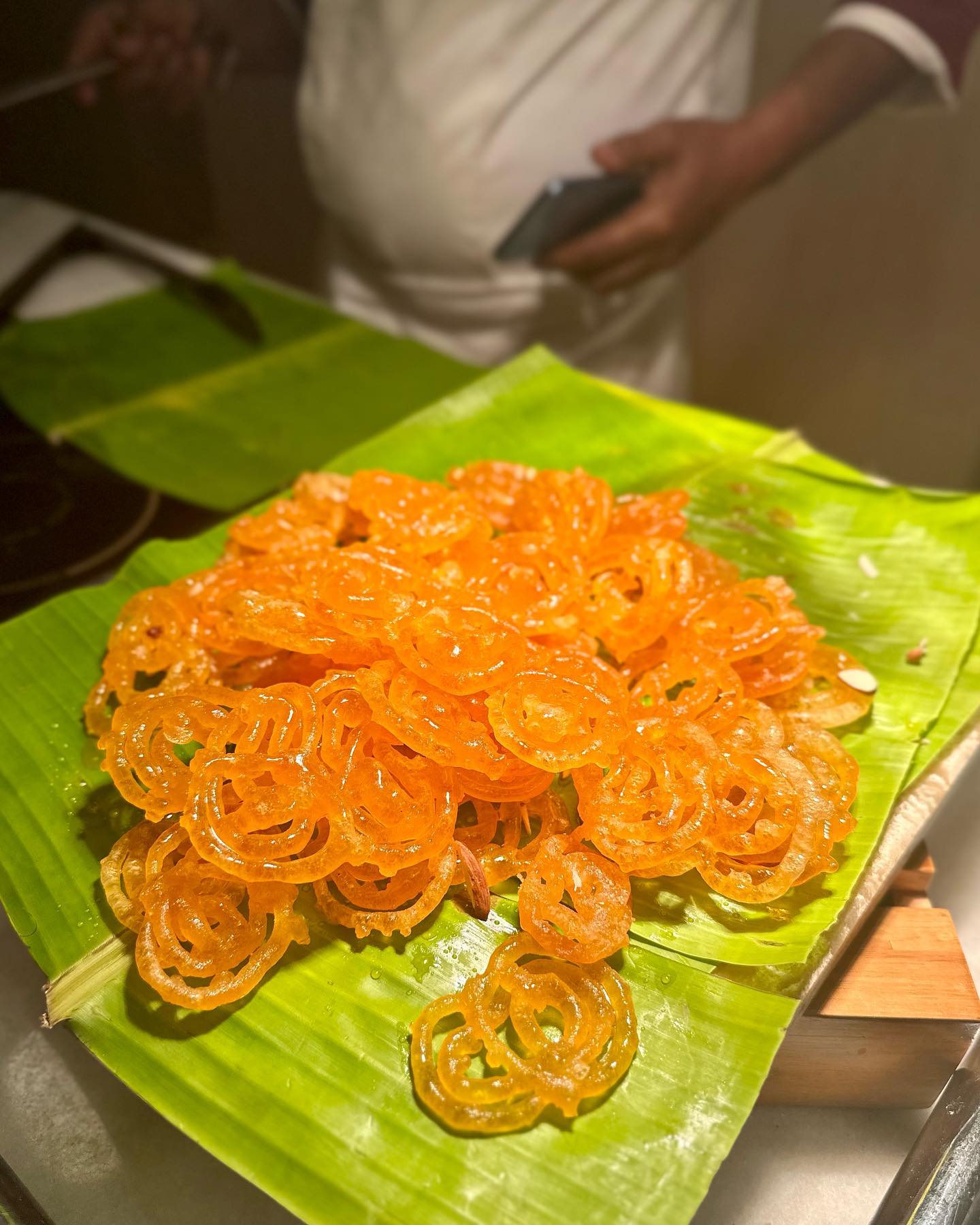 ケララ旅で散々、食べてきたばかりなのに、アッパム(米粉のパンケーキ)もおかわり。そして最後は、超絶高カロリーなインドで人気のお菓子「ジャレビ」で締めくくる。