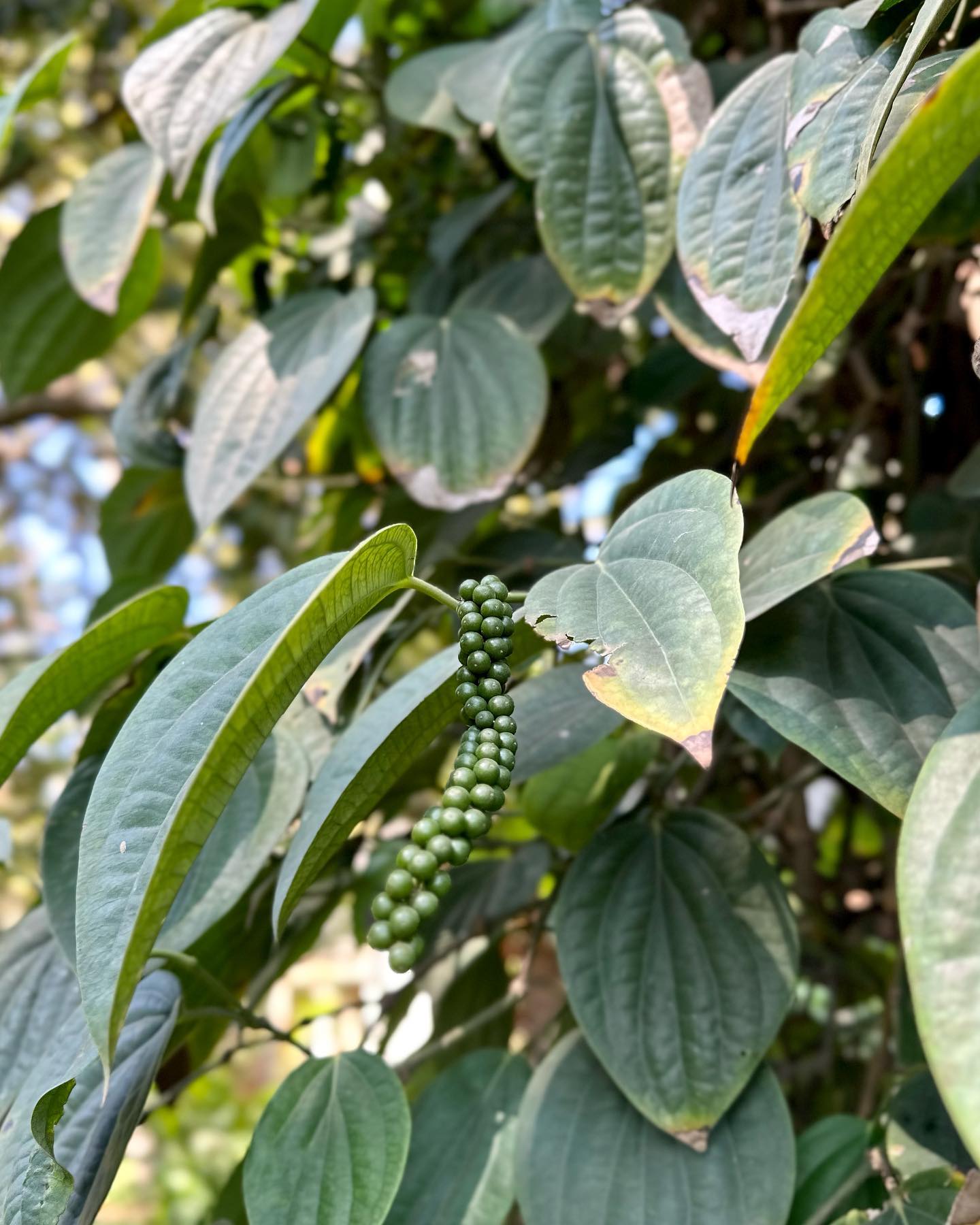椰子の大樹に絡みつく胡椒の蔓。我が家(旧居)の庭にもあり、毎年のように収穫してきたが、この胡椒の繁茂はダイナミック。上の方の実を取るのがたいへんそうだ。