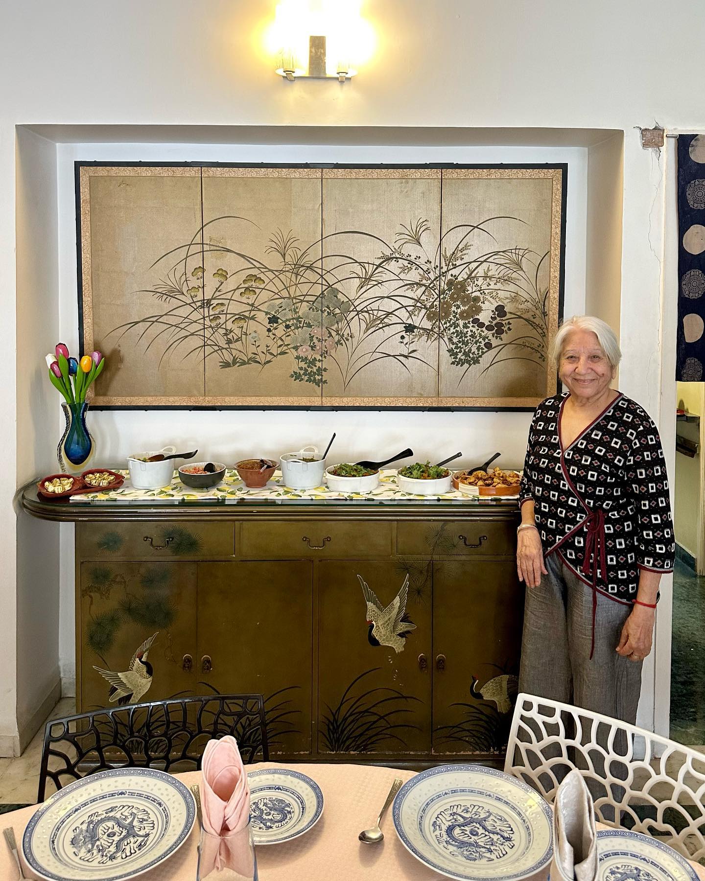 ウッタル・プラデーシュ州のラクナウが出身だという彼女だが、彼女の口からは、ご夫婦で日本を旅されたときのこと、日本での思い出話や数奇なご縁のお話が飛び出す。ご自宅の内装も、日本をはじめ、中国、韓国など、東アジアの家具調度品が配されていて、オリエンタルな雰囲気だ。昔、金沢で購入されたという屏風がひときわ上品に、日本の情趣を放っている。