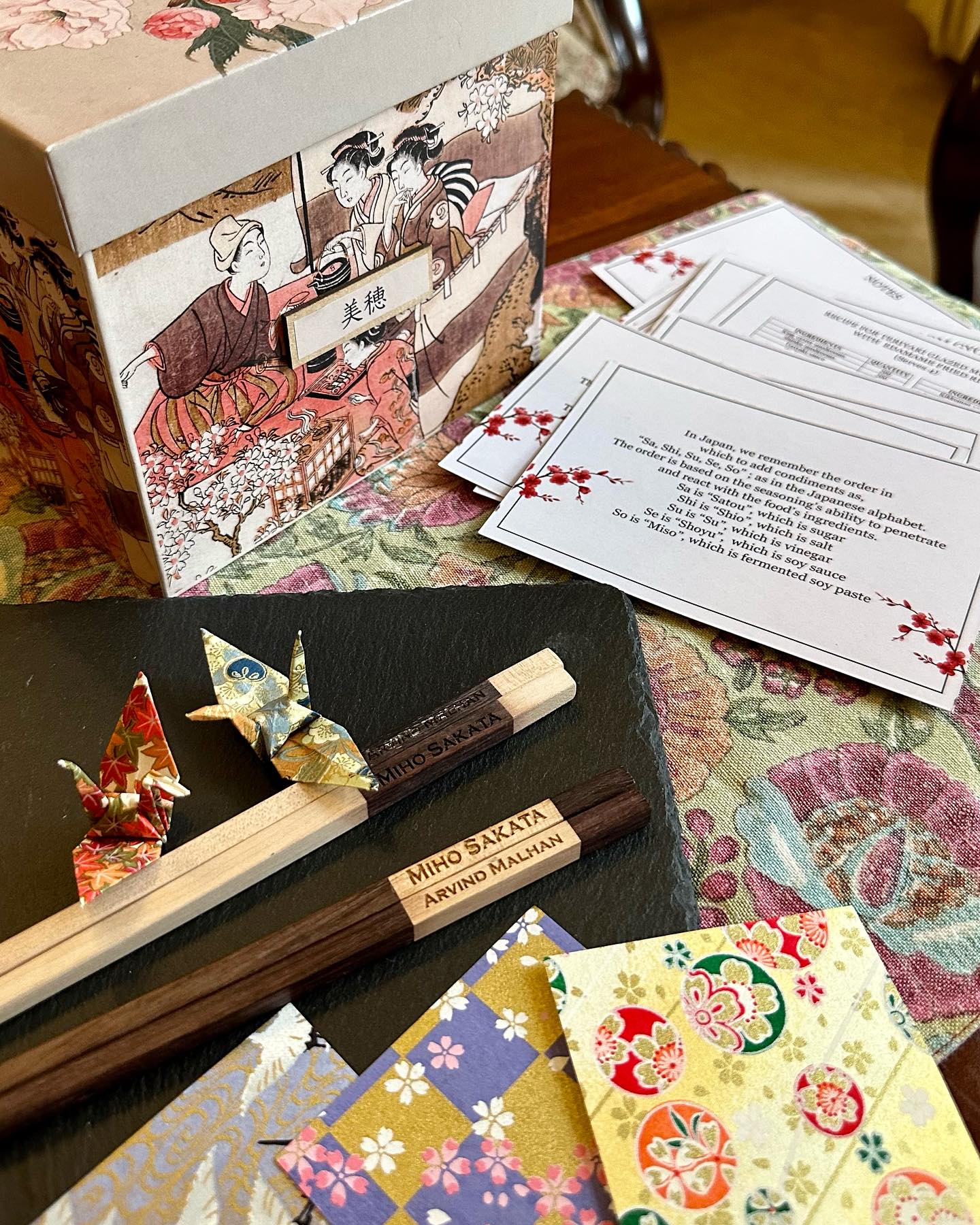 筆ペンと紙と千代紙さえあれば、日本風の世界が表現でき、特別なギフトになるのがいい。ちなみに、幹事が準備したギフトは、著作権フリーの写真をプリントしての日本風の箱、そして名入りの夫婦箸、寿司などを盛り付けるのに好適な黒い石製のお皿。WhatsAppで情報交換しつつ、彼らは瞬く間に、業者に頼んで準備してくれる。