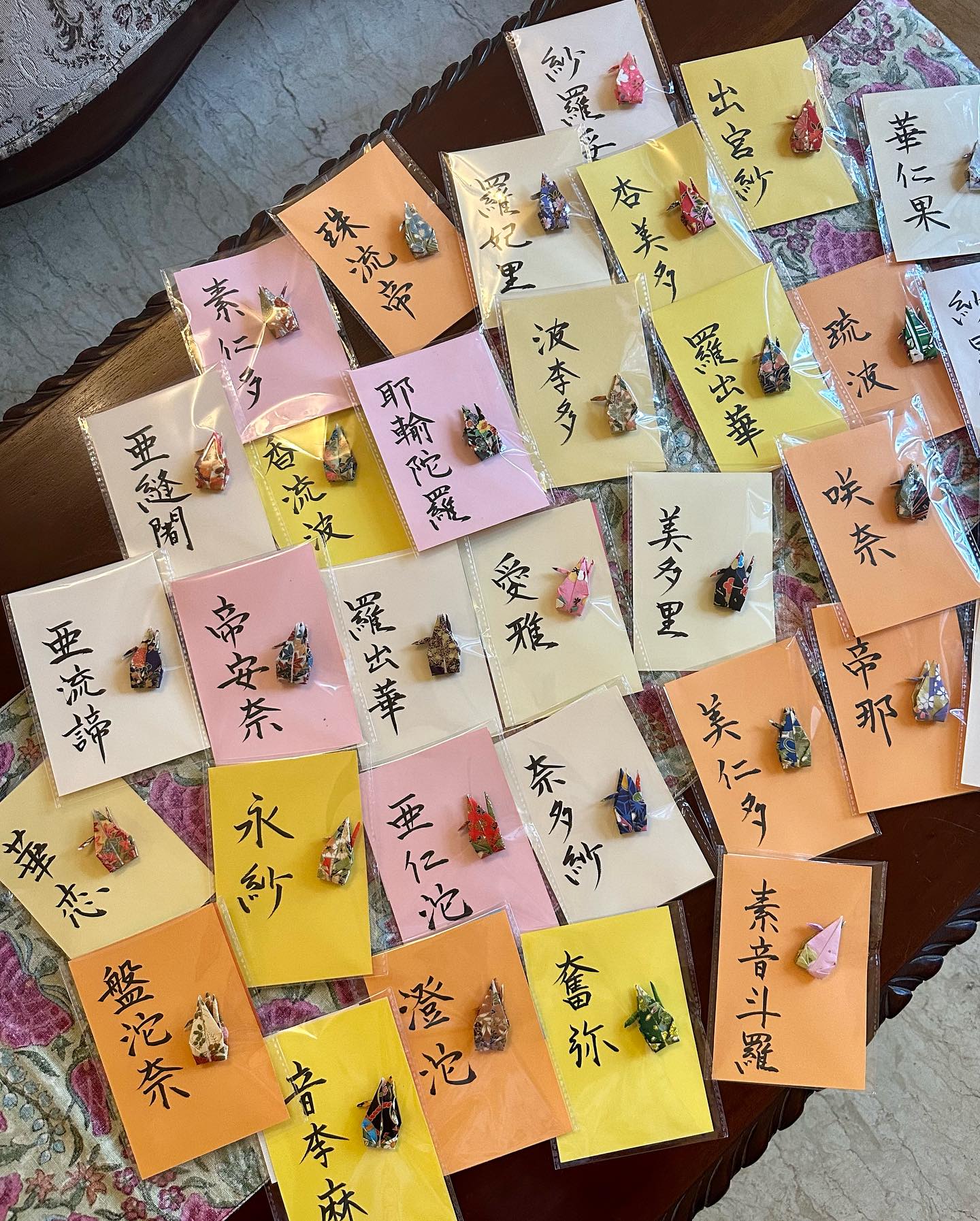 シェフによるクッキングのデモンストレーション、そしてわたしのレクチャー、食事……と豊かなプログラムだった。わたしからは、コンプリメントでギフトを準備。毎度のように、参加者の名前を「いい感じの漢字」の当て字で記し、京友禅柄のかわいらしい千代紙で鶴を折った。千代紙の美しさも、本当に格別。ミューズ・クリエイションの活動でも使ってきた千代紙。このごろは、一時帰国のたびに、上質なものを入手し、ギフトにアレンジして使っている。