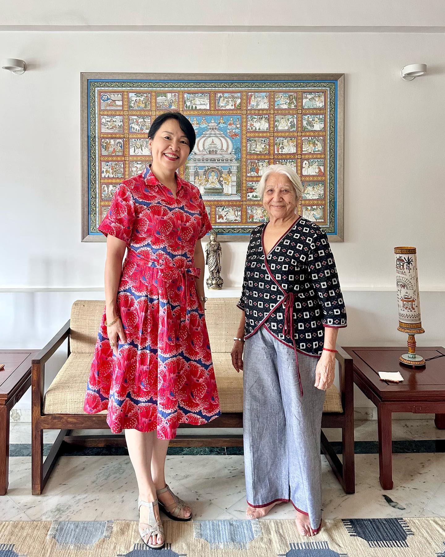 ウッタル・プラデーシュ州のラクナウが出身だという彼女だが、彼女の口からは、ご夫婦で日本を旅されたときのこと、日本での思い出話や数奇なご縁のお話が飛び出す。ご自宅の内装も、日本をはじめ、中国、韓国など、東アジアの家具調度品が配されていて、オリエンタルな雰囲気だ。昔、金沢で購入されたという屏風がひときわ上品に、日本の情趣を放っている。