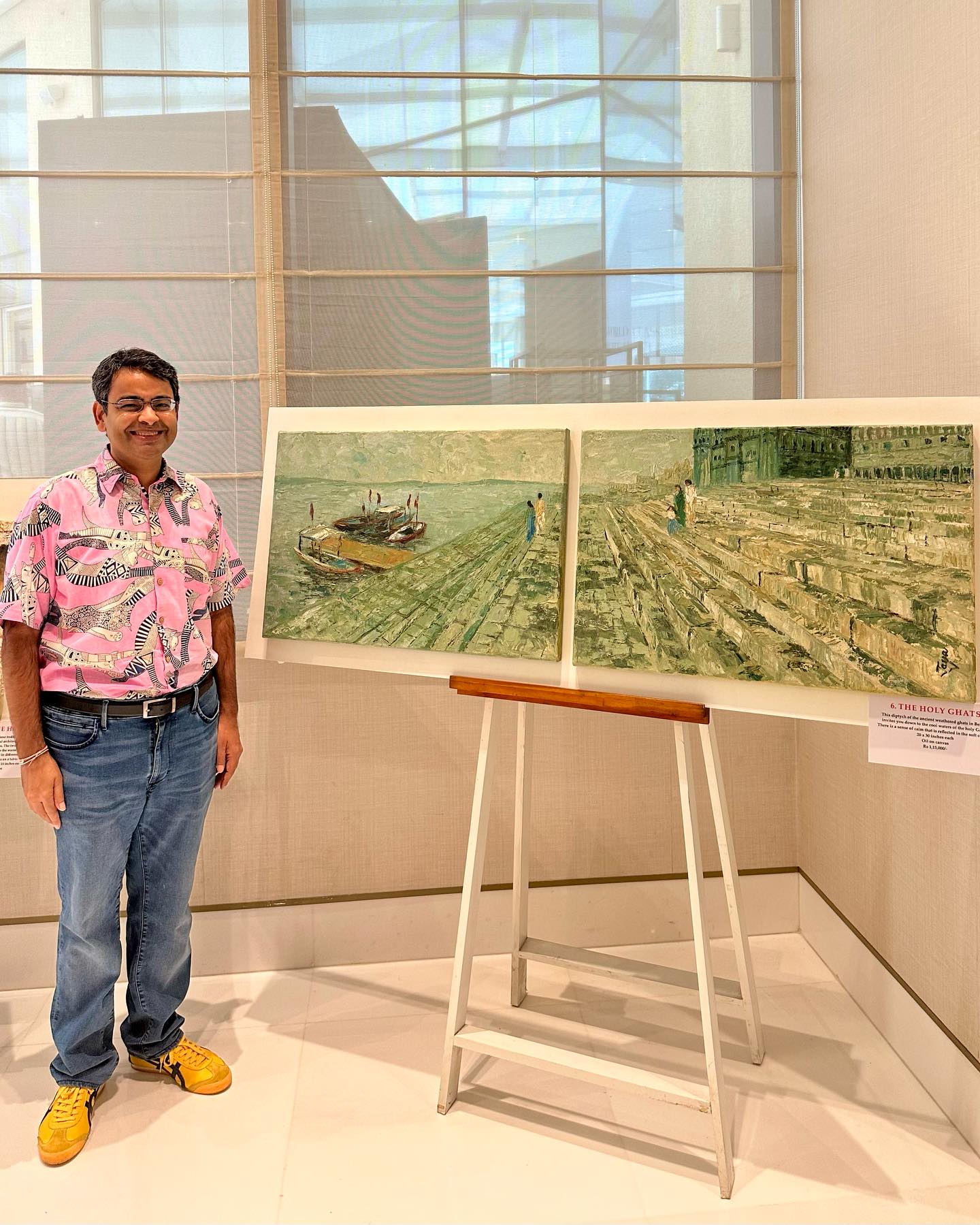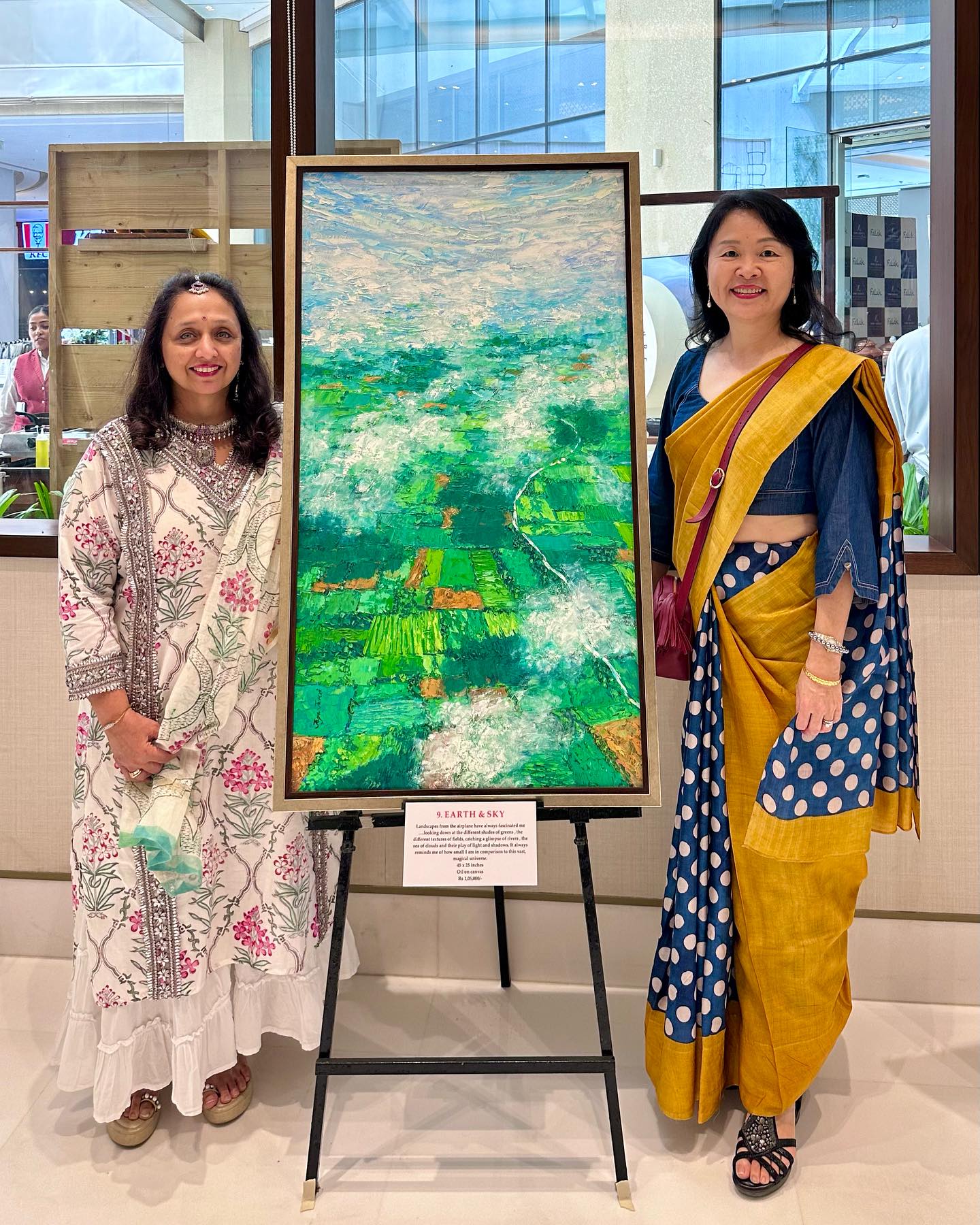 会場には、親しい友人や、久しく会っていなかった友人知人らにも会うことができ、話が弾む。ところで1枚目の写真は、友人のYashoとLakshmi。絵画の前に立つ2人の姿に目が釘付けになり、ポーズを取ってもらった。絵画とファッションが溶け込んでいる。本当にすてき。