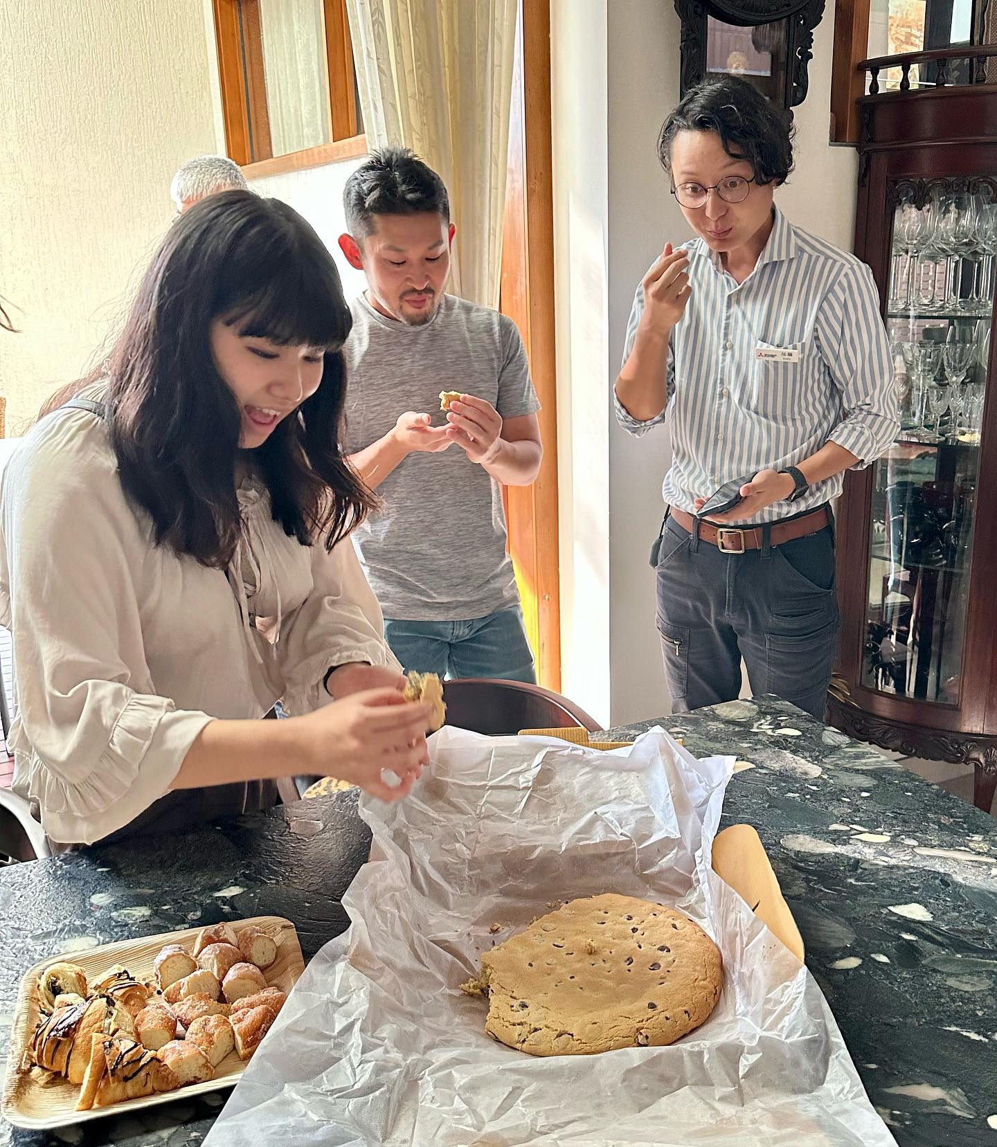皆が持ち寄ってくれたおつまみやスナックなども食べつつ、飲みつつ、語りつつ……。ところで、巨大なチョコレートチップ・クッキーは、我が友人の娘(16歳)が数年前に起業したベーカリーで販売されているもの。利益の半分を慈善団体に寄付するというコンセプトもさることながら、これが非常においしいのだ!