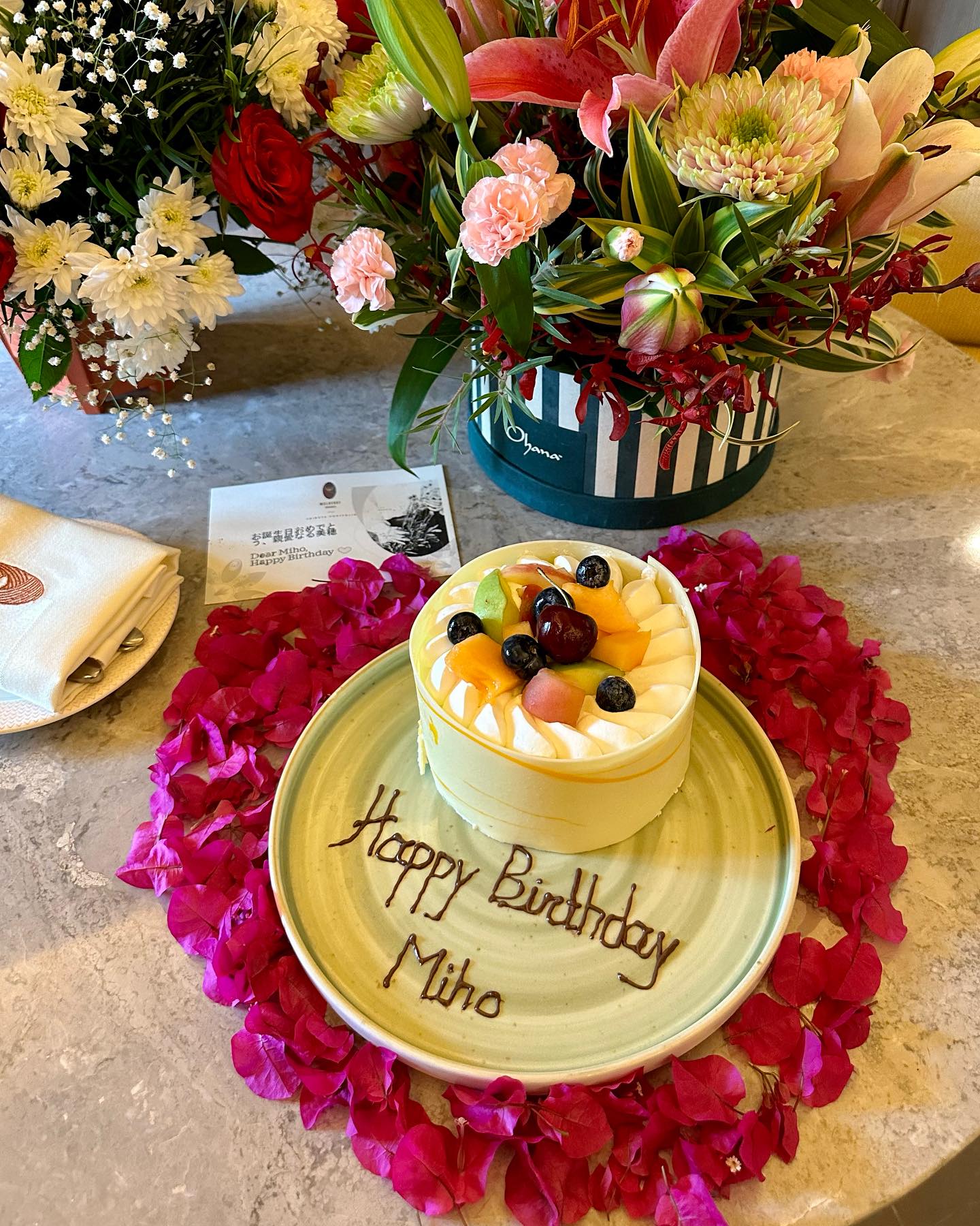 昨日の朝、夫が花を注文してくれていた。美しいアレンジメントを家に置き去りにするのは惜しく、ニューアーク・ミッションでいただいた花と一緒に、車に積み込んでホテルに持ってきた。それらを部屋に飾る。テーブルには、誕生日ケーキなども用意されている。