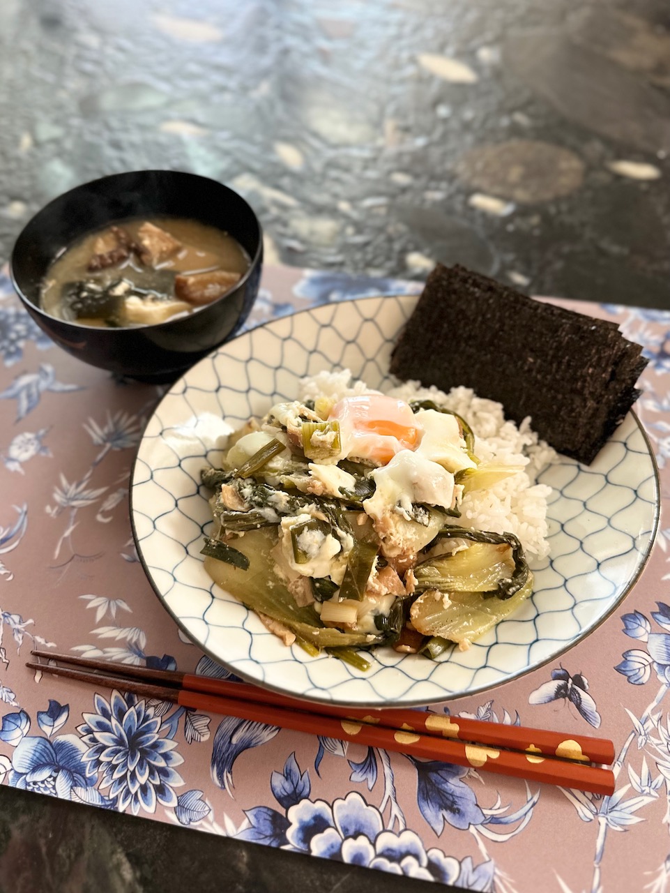 青梗菜とネギの炒め物。干し椎茸や高野豆腐入りの味噌汁。有明海の風味豊かな海苔。インド産の日本米「谷藤米」。放し飼い鶏の旨味ある卵……。