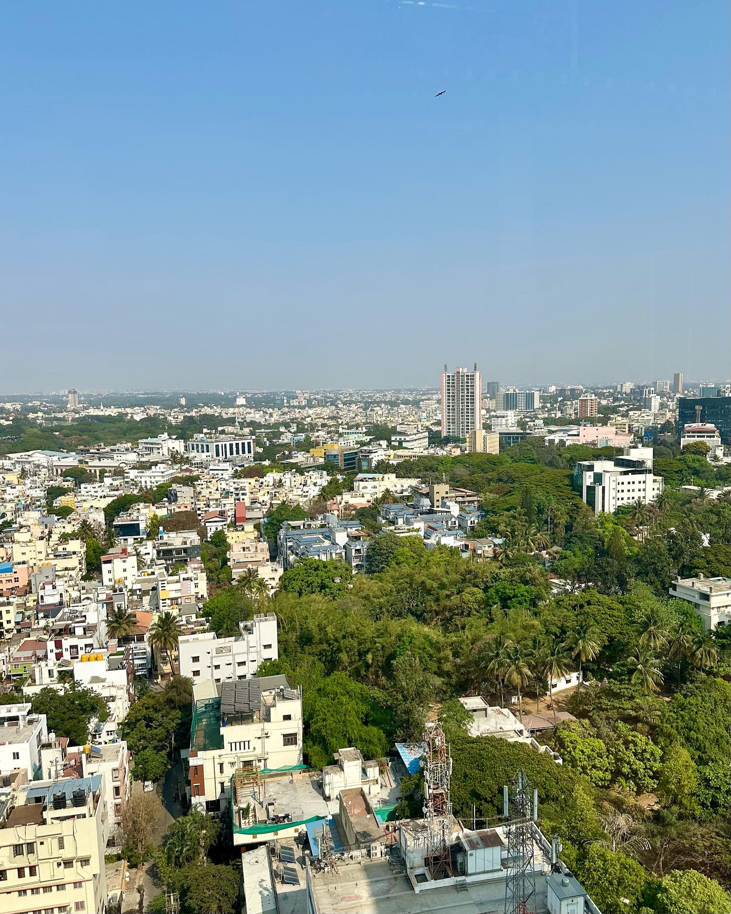 久しぶりながらも、店内の雰囲気は変わらず、迷わずいつもの、窓際のテーブルを選ぶ。ここからの景色を眺めると、インドへ来たばかりのことを思い出す。というのも、移住直後の2005年11月から2007年4月までの約1年半、この近くに暮らしていたからだ。上空写真の中央部分、緑に囲まれたブルーグレイの屋根のアパートメント・コンプレックスに住んでいた。懐かしいなあ……。