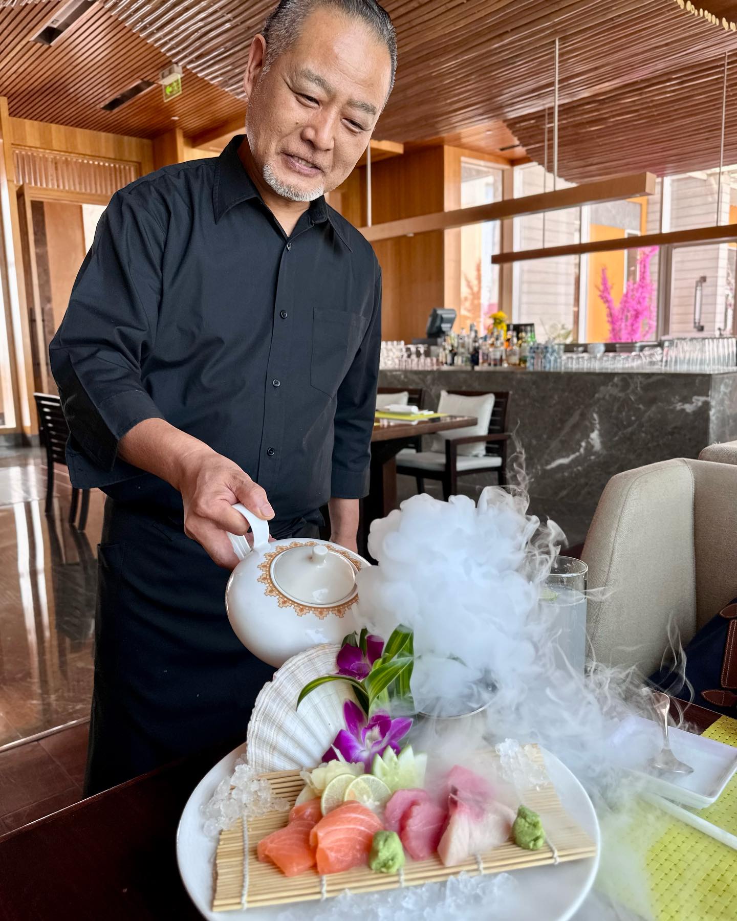そんな中、先日、Shangri La Hotelにてレストランのジェネラル・マネージャーから招待を受けていたので、夫と二人で上階の日本料理店、Yataiiへ赴いた。パンデミック以前は、よく訪れていた。ここに来るたびに、まずはホテルのロビーの花の前で写真を撮影していたものだ。今回も久々に、やってみる。