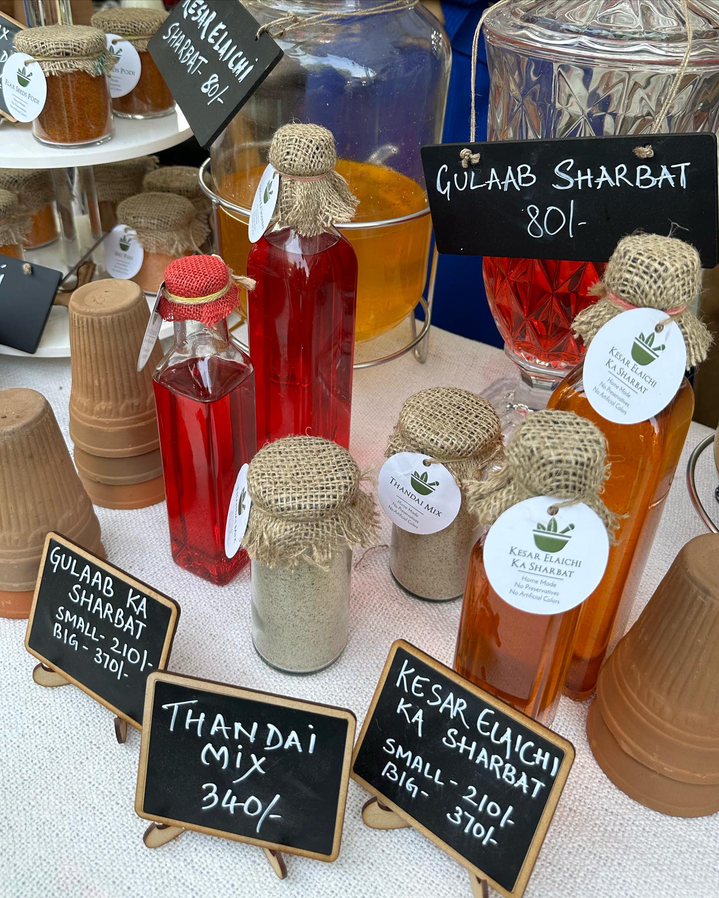 その翌日訪れたVEGAN MARKETにて。赤いボトルは天然のバラの花びらで作られた定番のシャルバット濃縮液。オレンジのボトルは、サフランとカルダモン入り。どちらも風味よく自然の味わい。購入した。