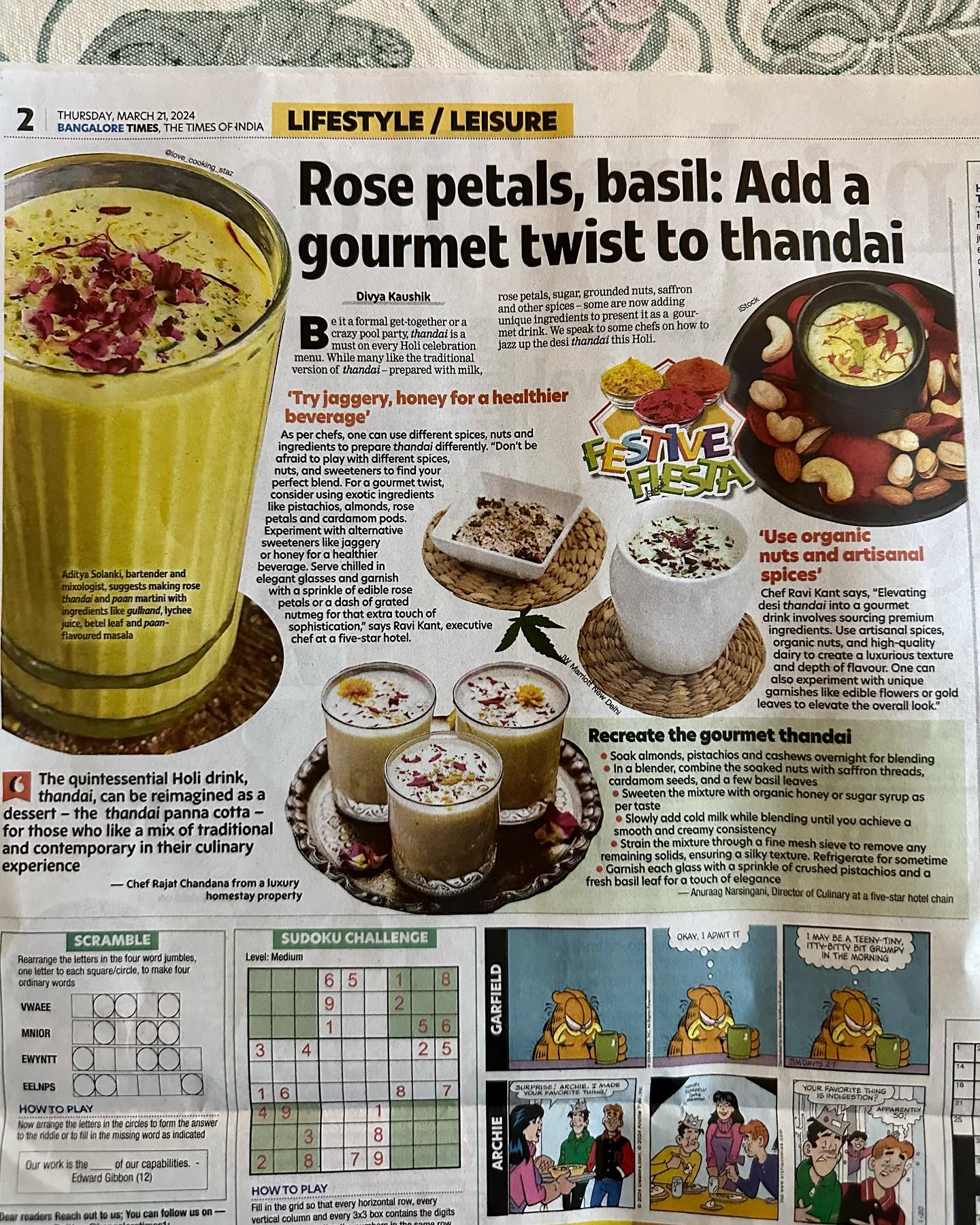 タンダイ (Thandai) もまた、ホーリーに欠かせない夏の飲み物。ミルクの中に、アーモンドやフェンネル、カルダモン、サフランなどのスパイスがブレンドされている。昨今のインドでは、昔ながらの飲み物を現代風にアレンジして飲むのが定番化している。新聞記事にもアレンジが紹介されるなど。新居完成以来2年間、やめていた新聞を、再び定期購読し始めた。やはり紙がいい。