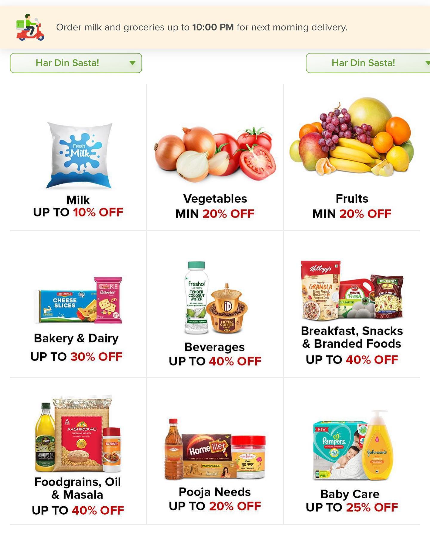 そのBigBasketが、COVID-19のロックダウン下で、新たなサーヴィスを開始した。スマートフォンにダウンロードしたアプリから注文できるBBdailyというもので、夜の10時までに注文したら、朝8時ごろまでに、玄関先まで配達してくれるというもの。最初は牛乳やヨーグルトなどの乳製品だけだったが、気づいたら、野菜に果物と次々に選択肢が増え、今や、スーパーマーケット状態。便利である。